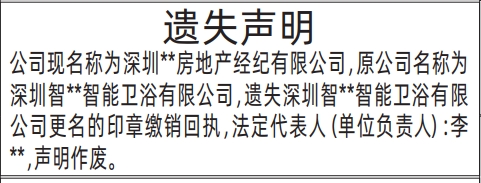 公司现名称为深圳**房地产经纪有限公司,原公司名称为深圳智**智能卫浴有限公司,遗失深圳智**智能卫浴有限公司更名的印章缴销回执,法定代表人(单位负责人):李**,声明作废。