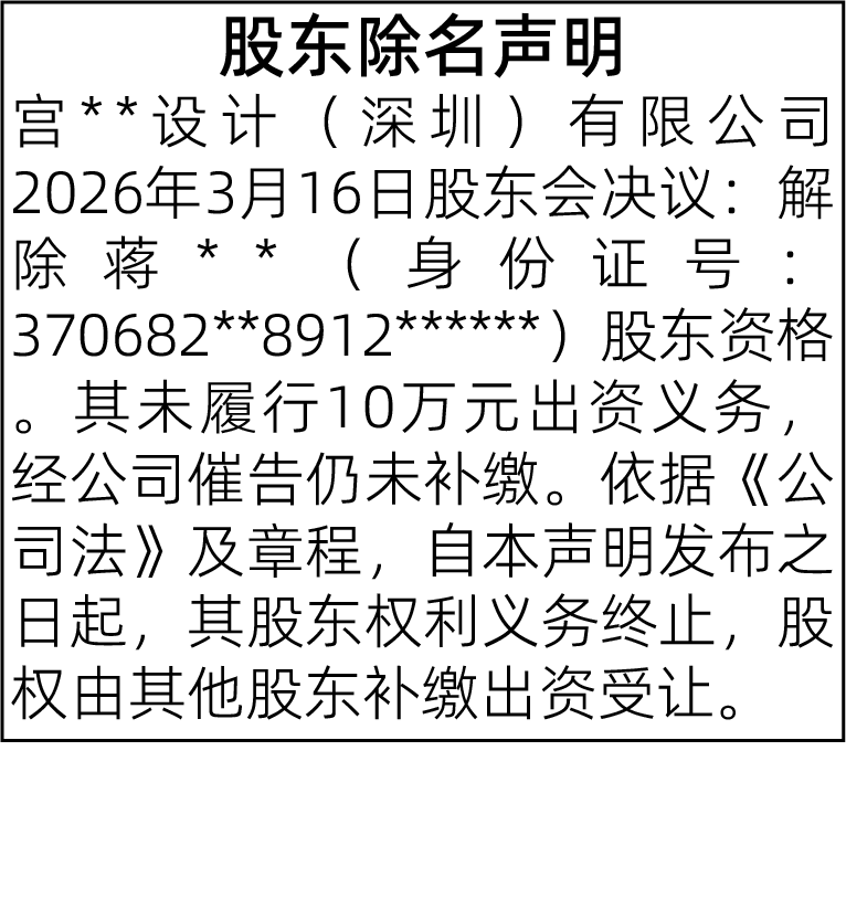 宫**设计(深圳)有限公司2026年3月16日股东会决议:解除蒋**(身份证号:370682**8912******)股东资格。其未履行10万元出资义务,经公司催告仍未补缴。依据《公司法》及章程,自本声明发布之日起,其股东权利义务终止,股权由其他股东补缴出资受让。