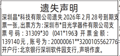深圳晶*科技有限公司遗失2026年2月28号到期支票一张,出票方为:深圳市*目光学器件有限公司支票号码:31309*30(041*1963)开票金额:139140元,账号为:20000061**3200105562776开户行:北京银行深圳软件园支行,声明作废。