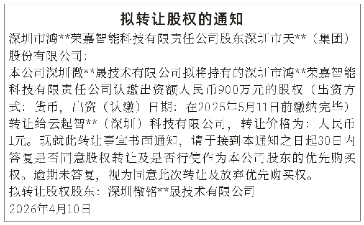 本公司深圳微**晟技术有限公司拟将持有的深圳市鸿**荣嘉智能科技有限责任公司认缴出资额人民币900万元的股权(出资方式:货币,出资(认缴)日期:在2025年5月11日前缴纳完毕)转让给云起智**(深圳)科技有限公司,转让价格为:人民币1元。现就此转让事宜书面通知,请于接到本通知之日起30日内答复是否同意股权转让及是否行使作为本公司股东的优先购买权。逾期未答复,视为同意此次转让及放弃优先购买权。